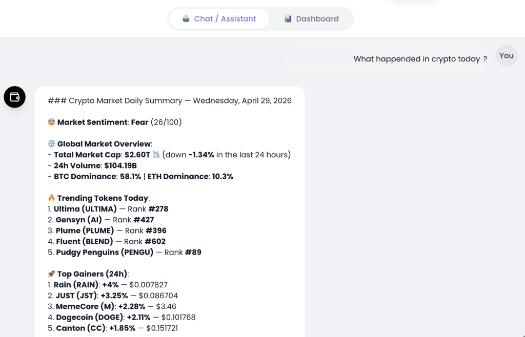 Ask anything about your holdings. Balances, performance, transaction history, DeFi positions — your assistant breaks it all down clearly.